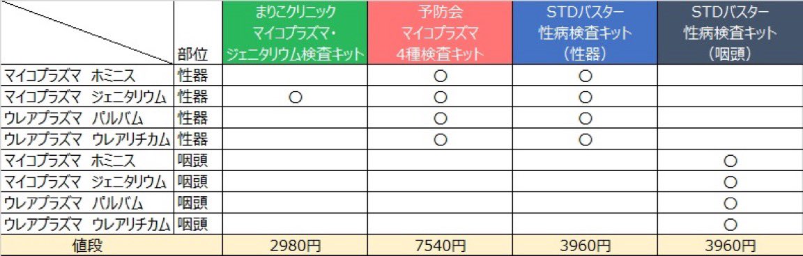 マイコプラズマ・ウレアプラズマ 性病検査項目・価格 比較表(2025年10月時点 筆者独自調べ)