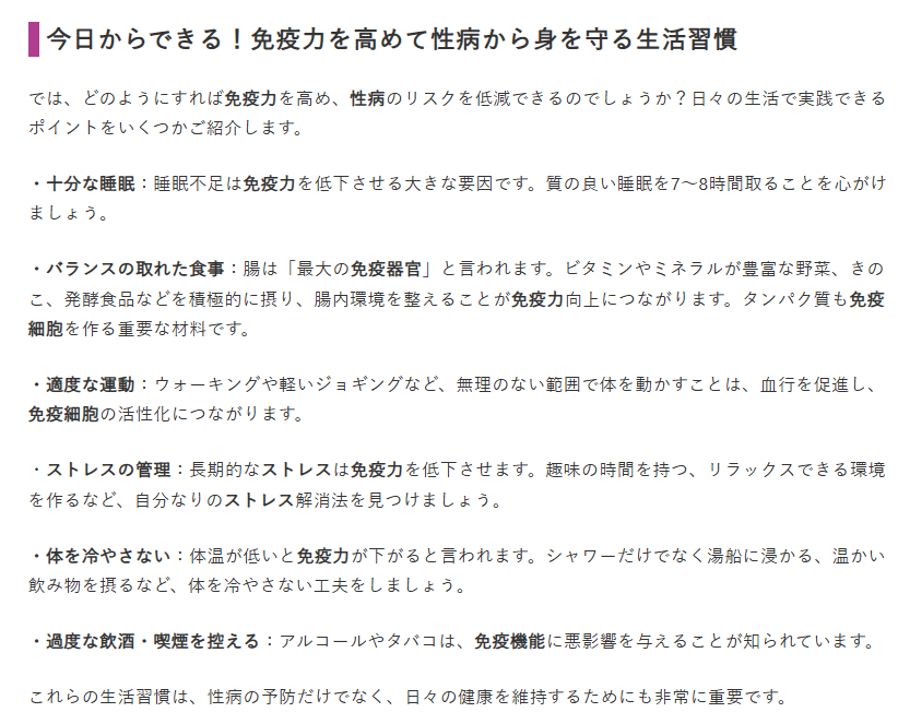 生活習慣を見直し、免疫を高めることで性病罹患率を下げることが可能ですので意識してみると良いと思います。