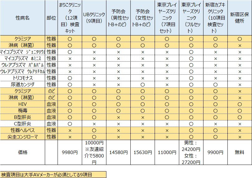 性病検査セット 検査項目×価格 比較表(2025年10月時点 筆者独自調べ)