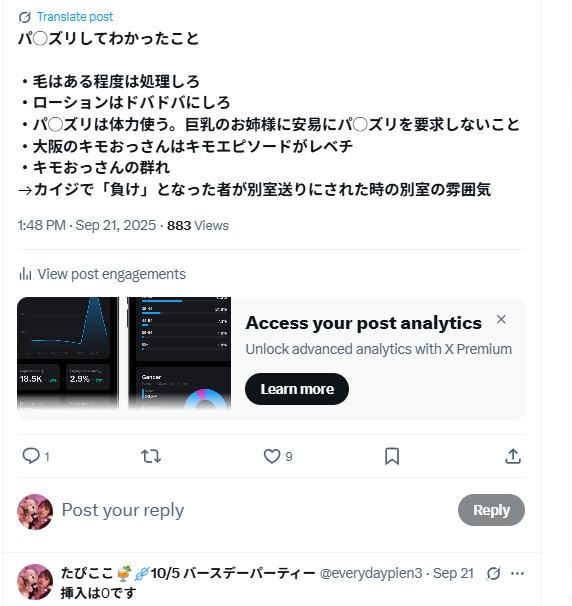 聞くと、前回、あな痔なのにその場の面白さ重視してア◯ルにペニバン挿入したらしい。理由は女の子がぺ二バンを挿入したいといったが誰も手を挙げなかったため。