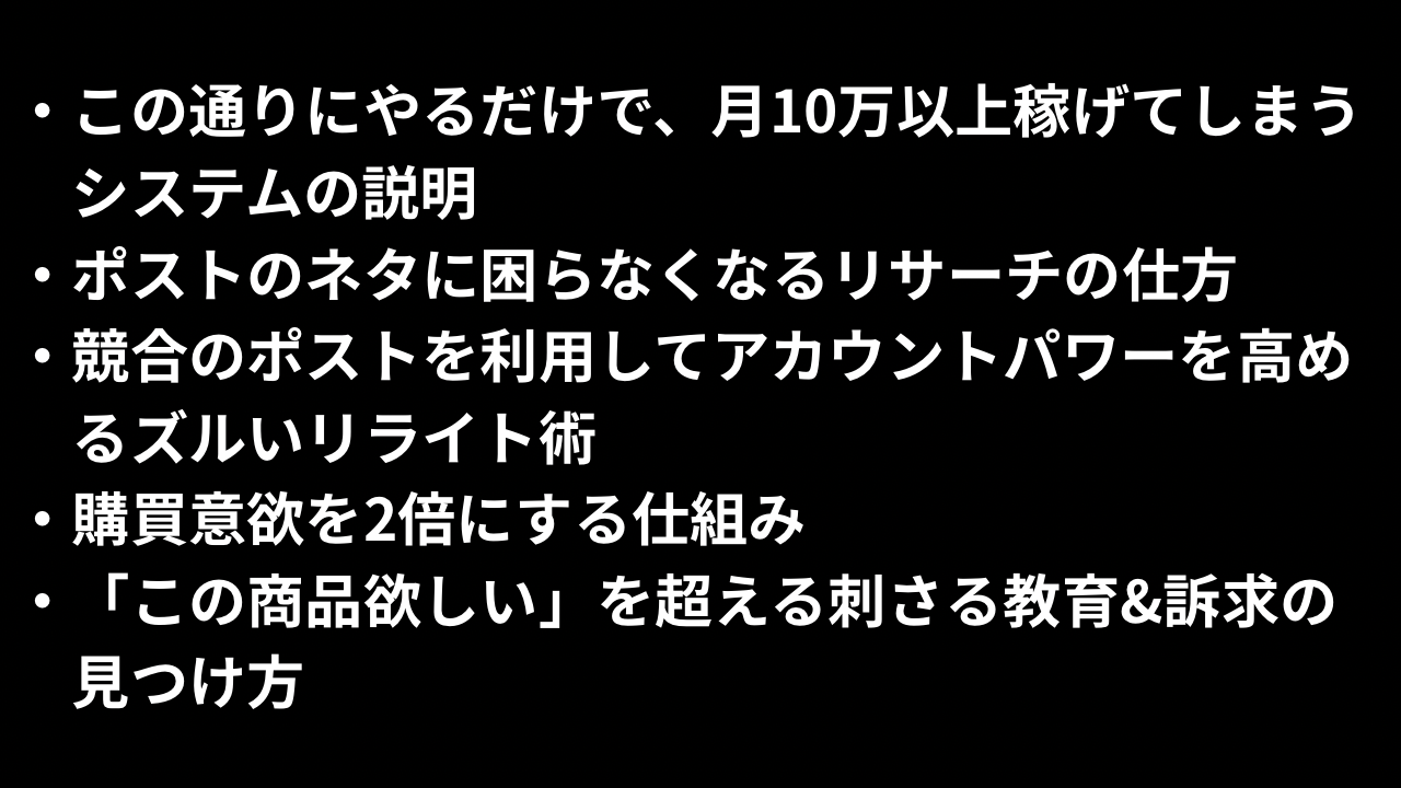 アカウント設計から商品販売後に商品を継続して売る全行程について解説しているため、この通りにやれば、1ヶ月で投資分を回収し、どんどん売上を伸ばしていくことができます。