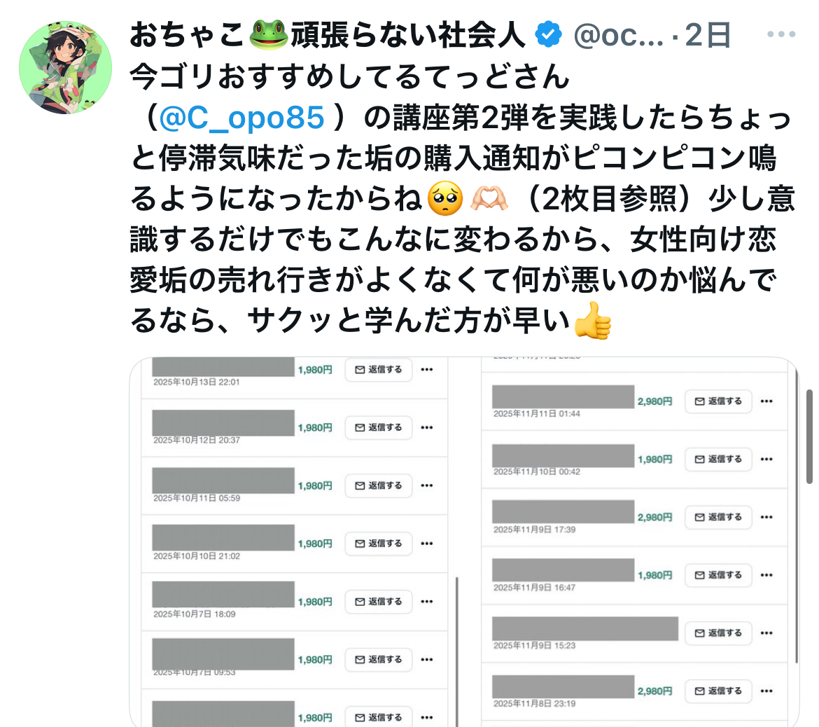 本コンテンツ販売から間も無いですが既に多くの成果報告を頂いてます