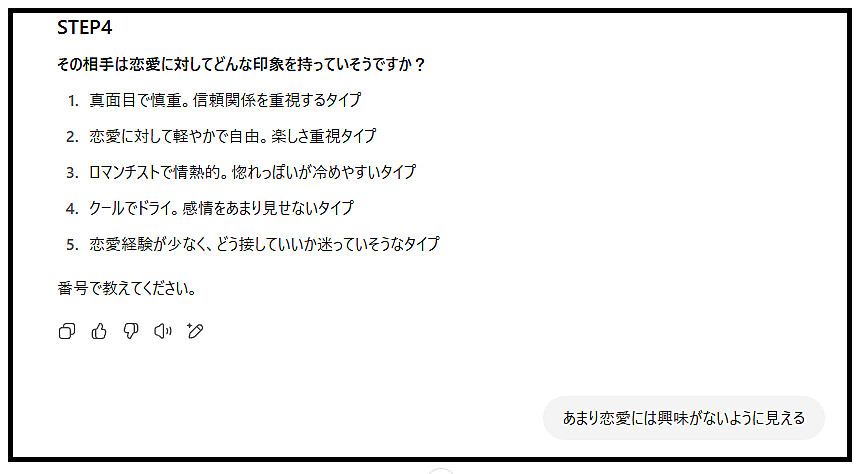 質問を返すと、STEP5までさらに質問が続きます。
