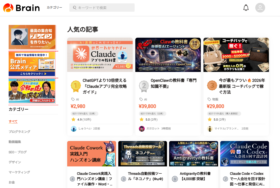 Brainは最大50%のアフィリエイト機能とレビュー機能など、拡散力が高くなる機能を用意したプラットフォームです。
