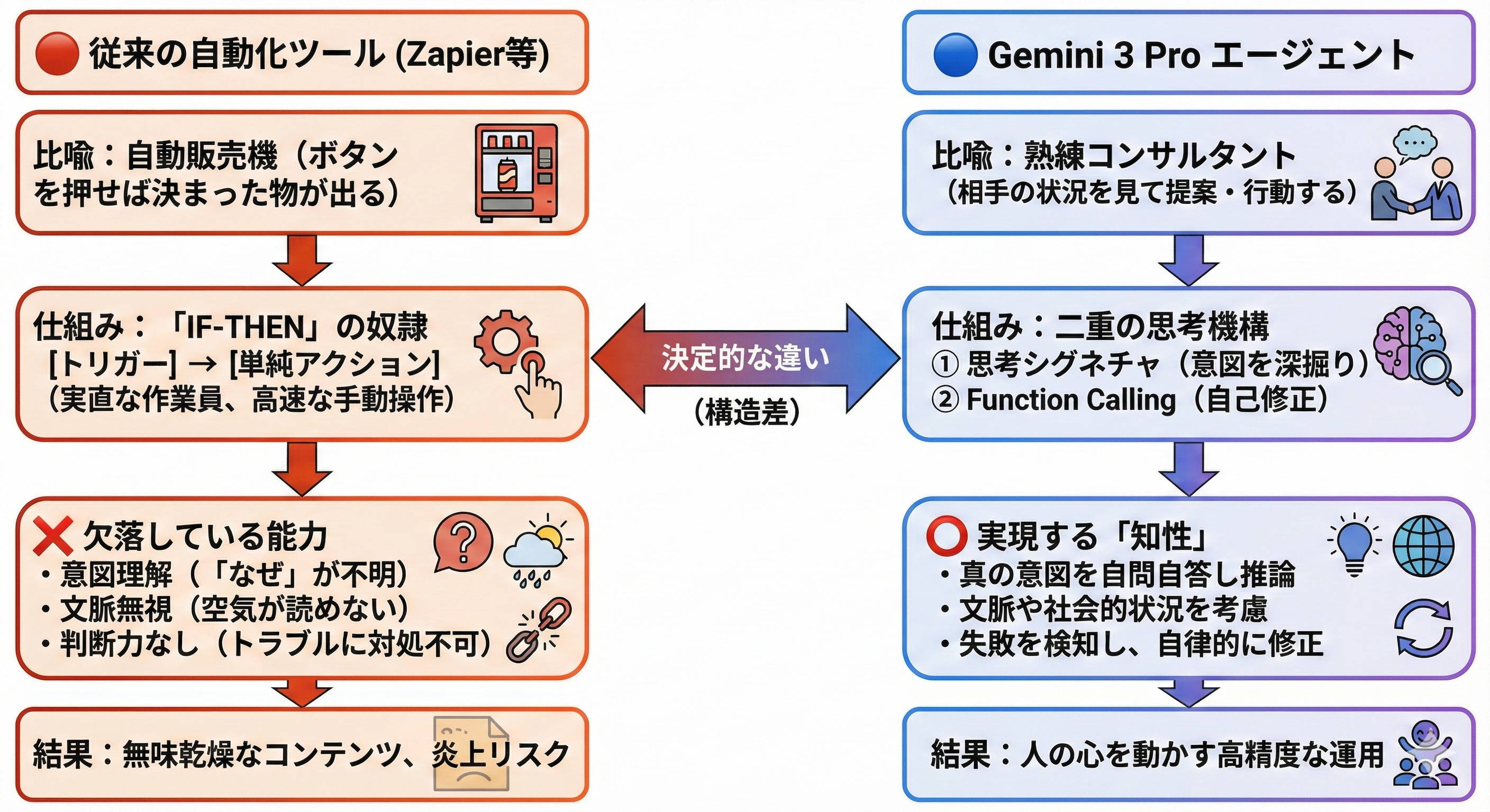 例えるなら、**従来の自動化ツールが「自動販売機」であるとするならば、Gemini 3 Proのエージェント機能は「自律的に思考し、行動する熟練コンサルタント」**です。ボタンを押せば決まったジュースが出る機械と、あなたの顔色を見て「今日はお疲れのようですね、温かいお茶にしますか?」と提案してくれる人間。この決定的な構造の違いを理解しなければ、どれだけ高価なツールを使っても、人の心を動かす高精度なSNS運用は実現しません。