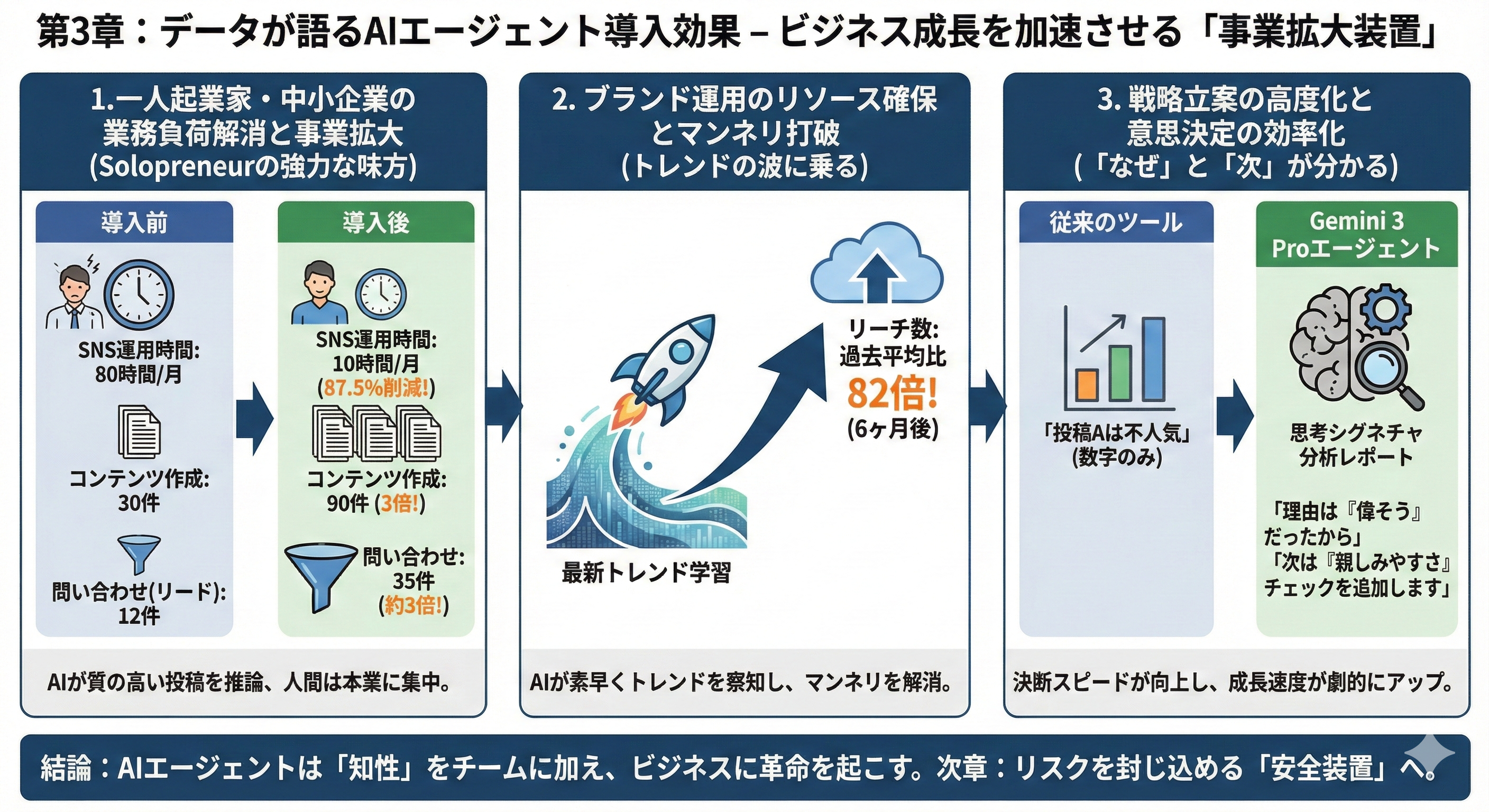 なぜこれほど成果が出たのか? 単に投稿の数が増えたからではありません。エージェントが、過去のデータを分析し、「どんな話題ならお客様が興味を持つか」を自ら考え(推論し)、質の高い投稿を続けたからです。 人間は、浮いた90%の時間を使って、問い合わせをくれたお客様への丁寧な対応や、サービスの改善に集中できました。その結果、ビジネス全体が急成長したのです。