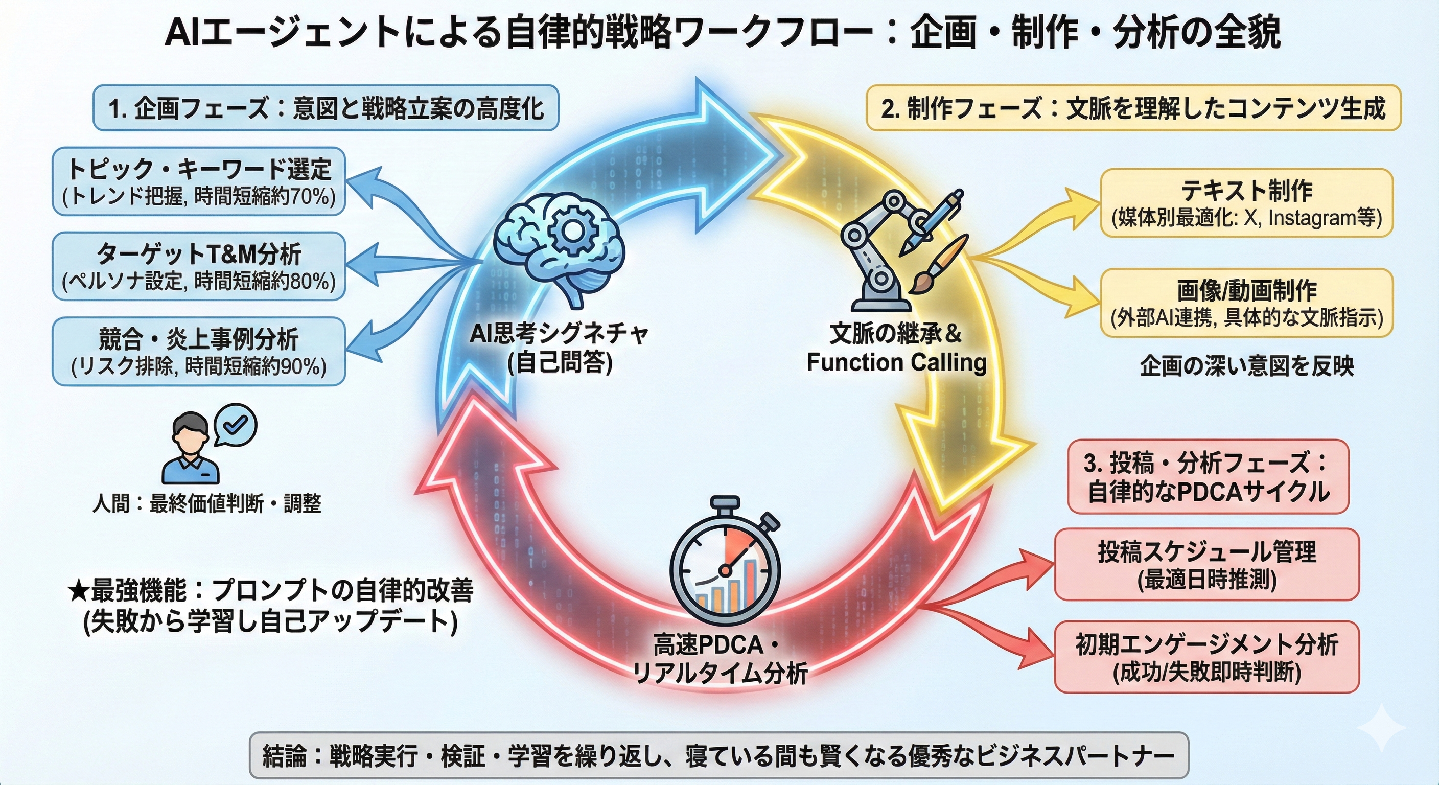 AIエージェントの価値は、単に面倒な作業を代わってくれることだけではありません。その本質は、SNS運用において最も頭を使い、人間が疲れ果ててしまう**「企画・制作・投稿・分析」**という全てのサイクルにおいて、AI自身が戦略を立て、実行までやり遂げる点にあります。