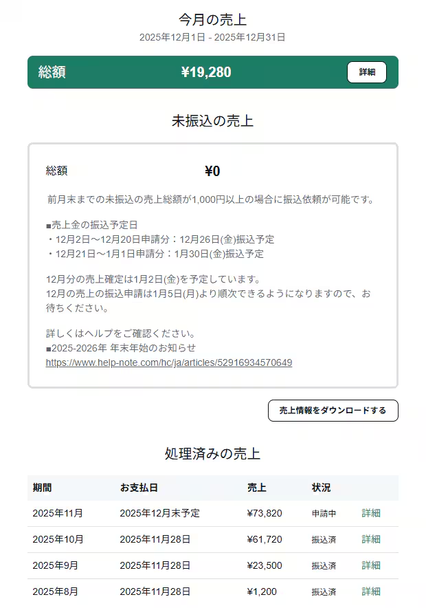 2025年12月14日時点で、note売上の推移はこんな感じ👇