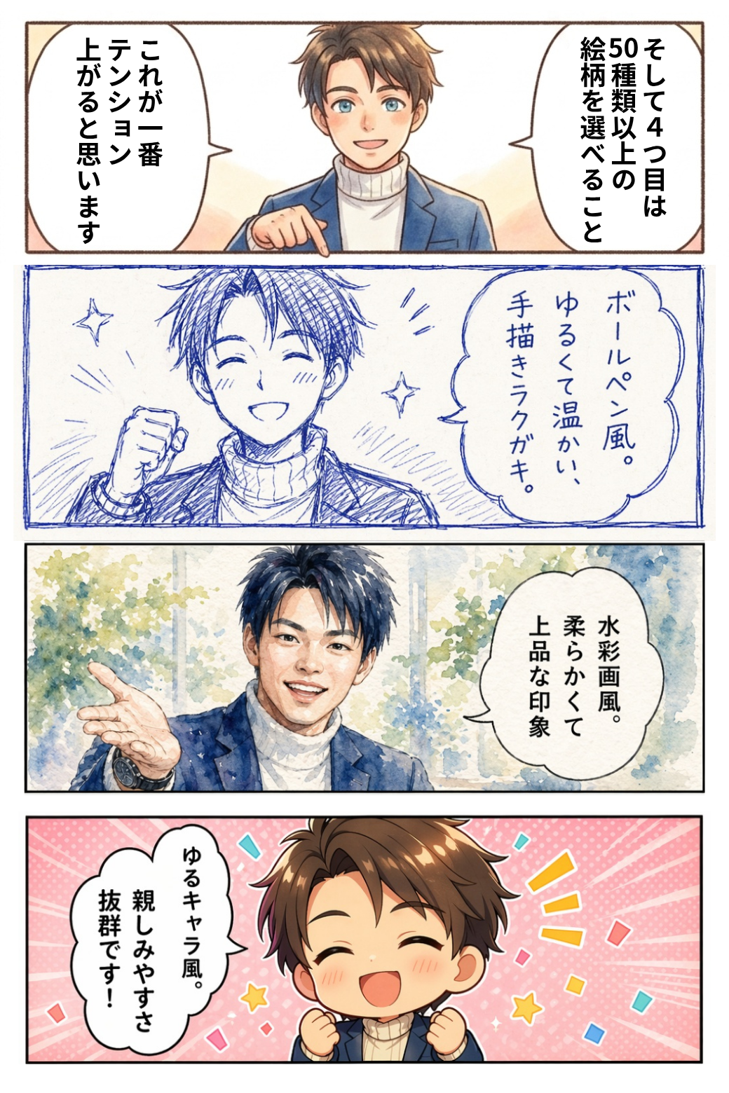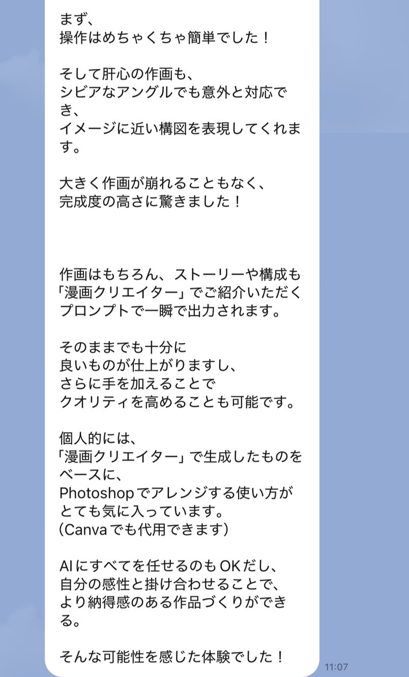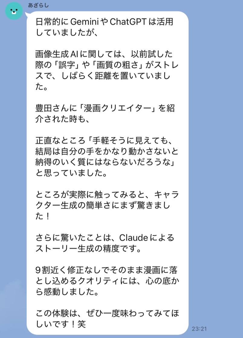 AIマーケティングで一番大事なのは"何を表現するか"。文章だけだとどうしてもAI味が出てしまう中、漫画は文字と絵で補い合える最強のメディアです。メルマガやブログのフックに差し込むだけで、視覚情報として記憶にも残ります。表現を諦めていた人こそ、絶対に使うべきツールですね。