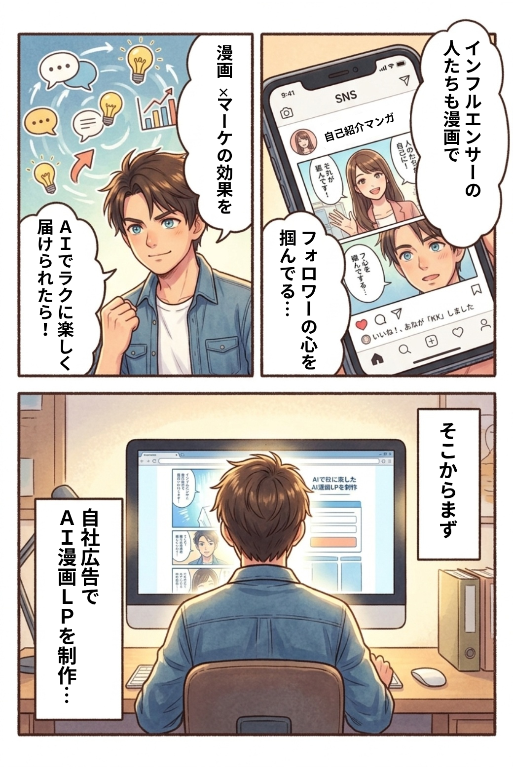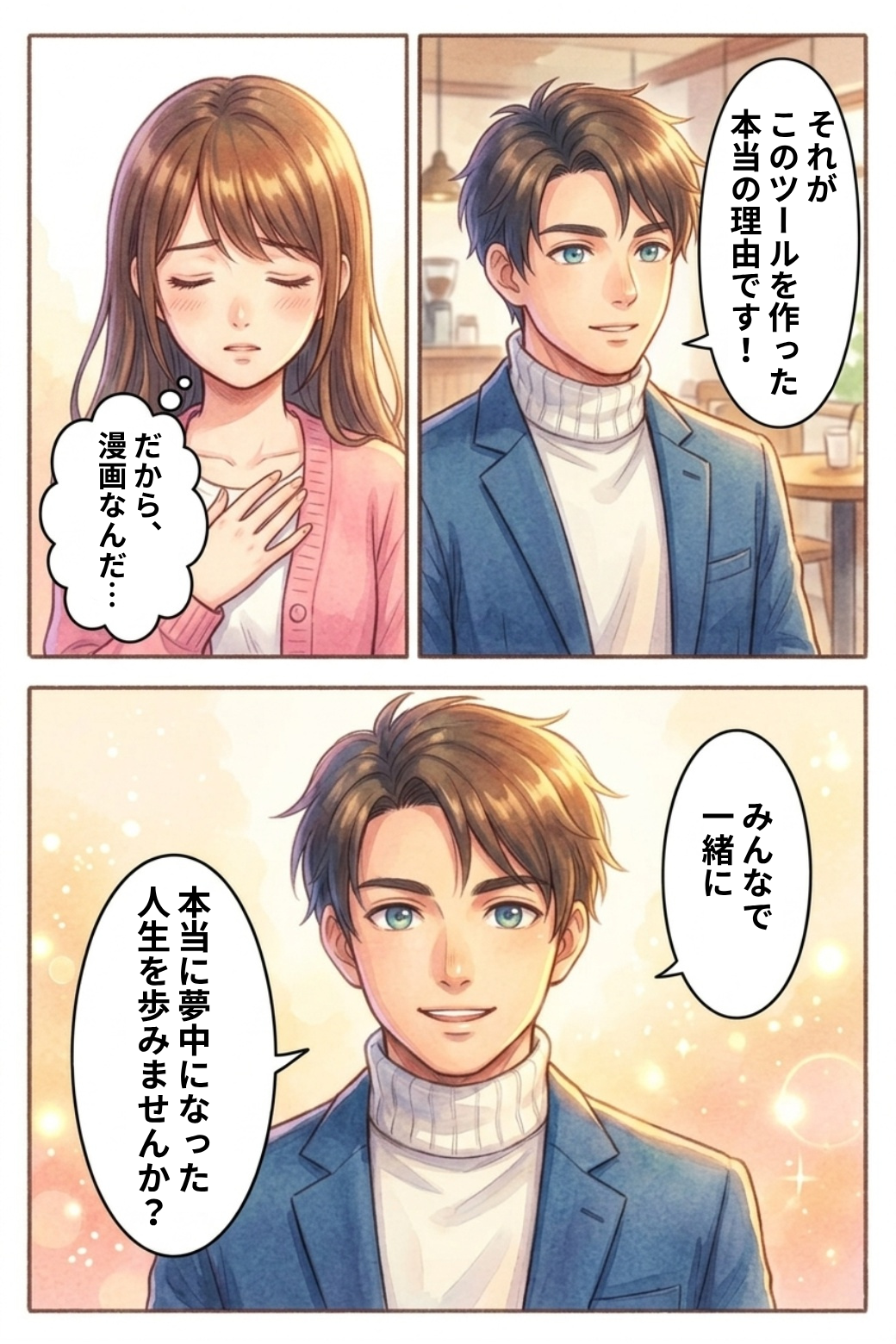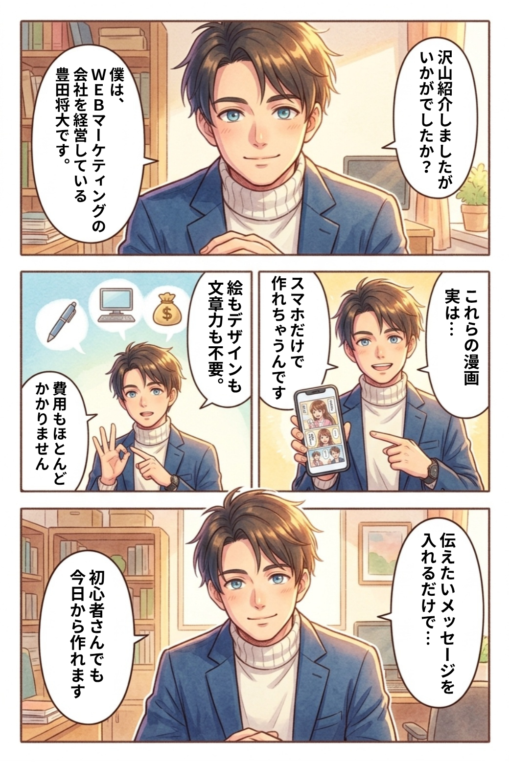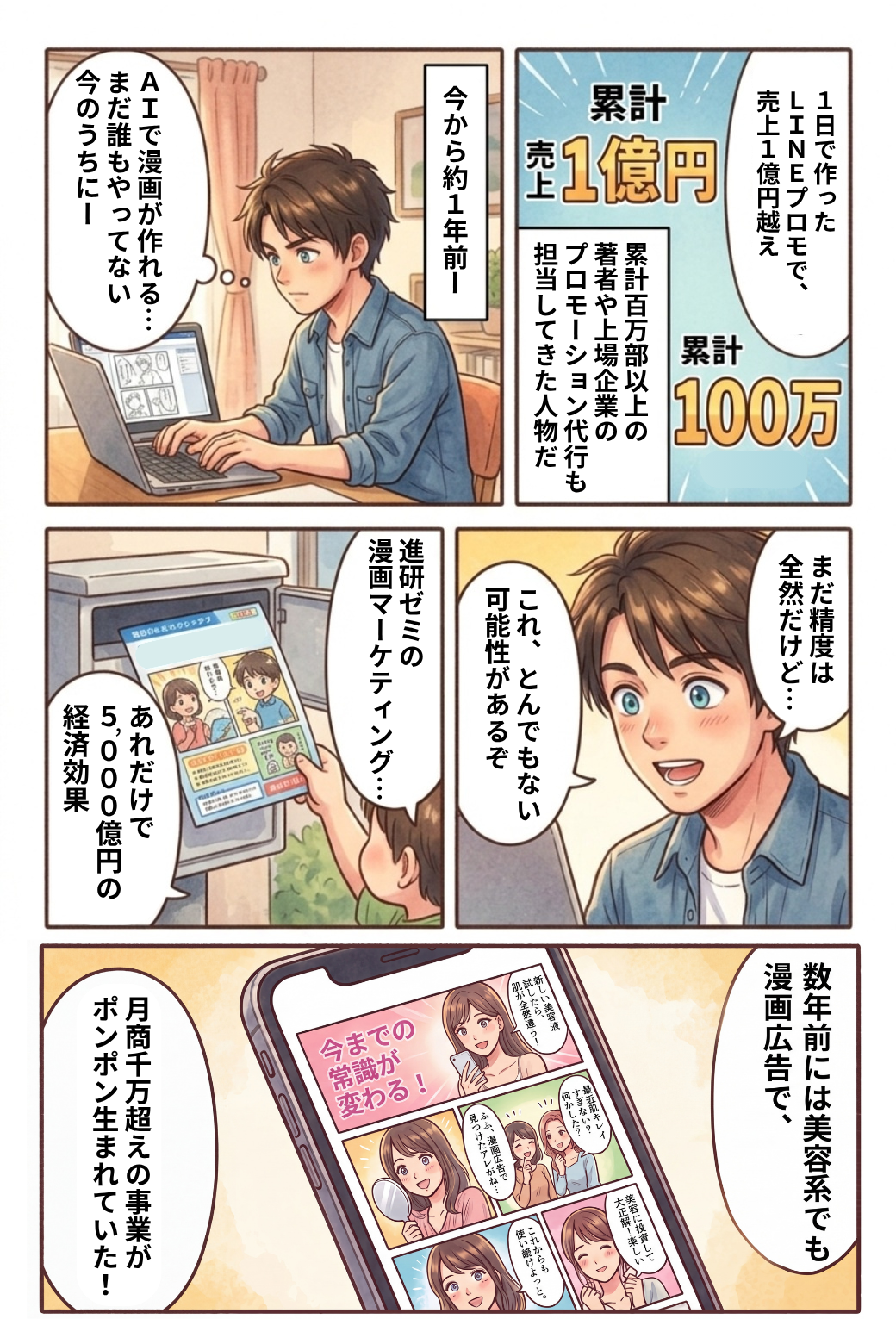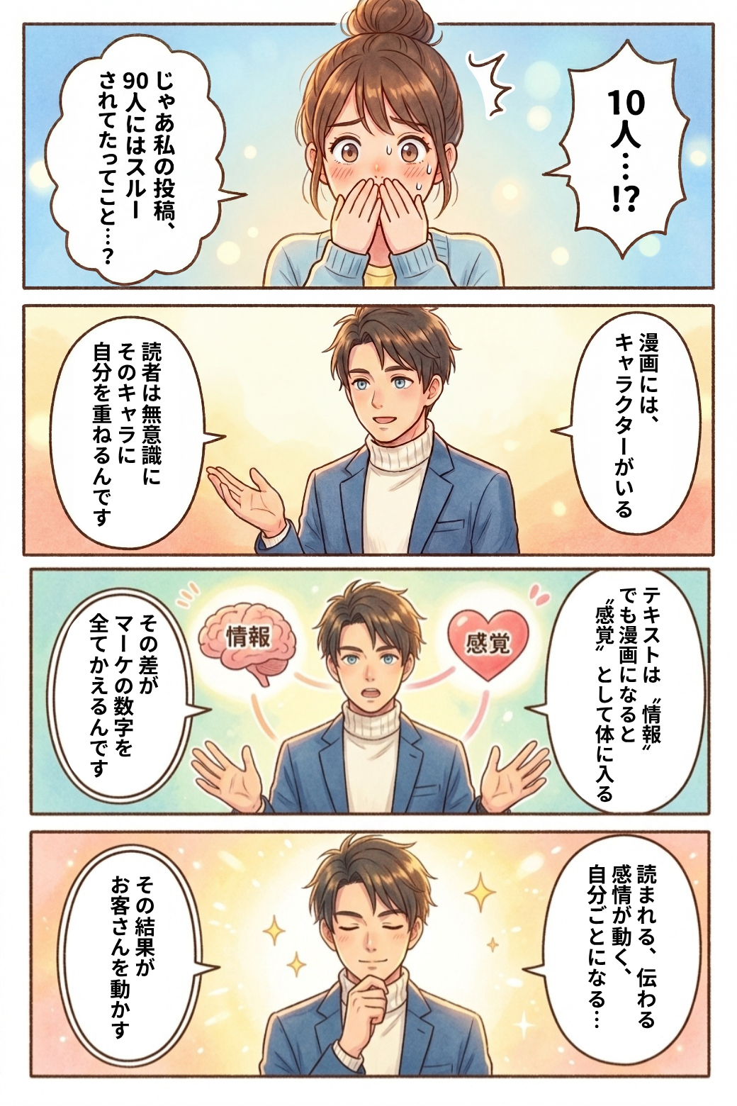 AI時代だからこそ、一目で伝わる漫画が最強です。教材の説明、アフィリエイト投稿、LINE配信——どこに差し込んでも引き込まれる。文章だと"うんちくっぽく"なるこだわりも、漫画なら一瞬でエンタメに変わります。「漫画が購入につながる」という意識を、全マーケターが持つべきです。