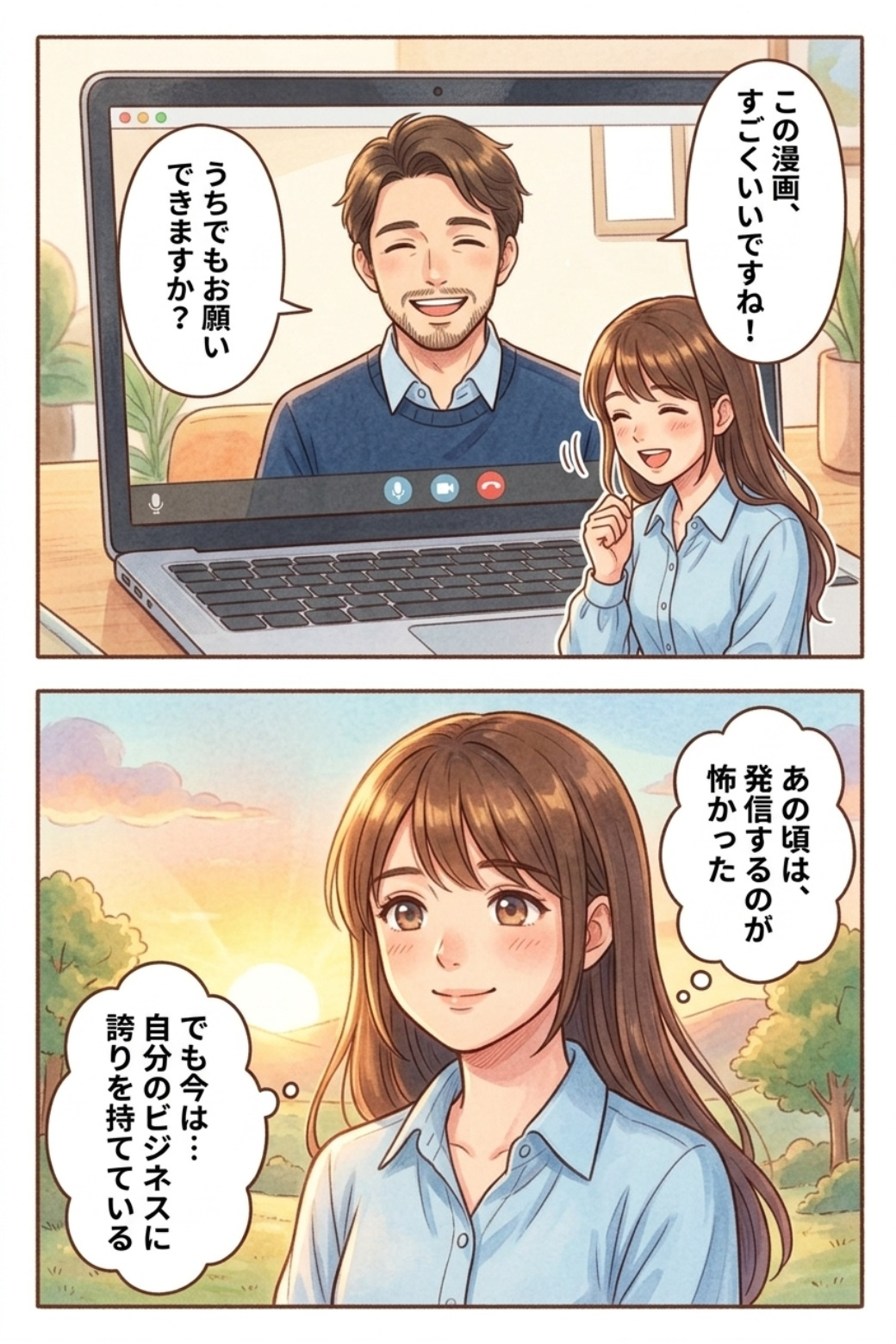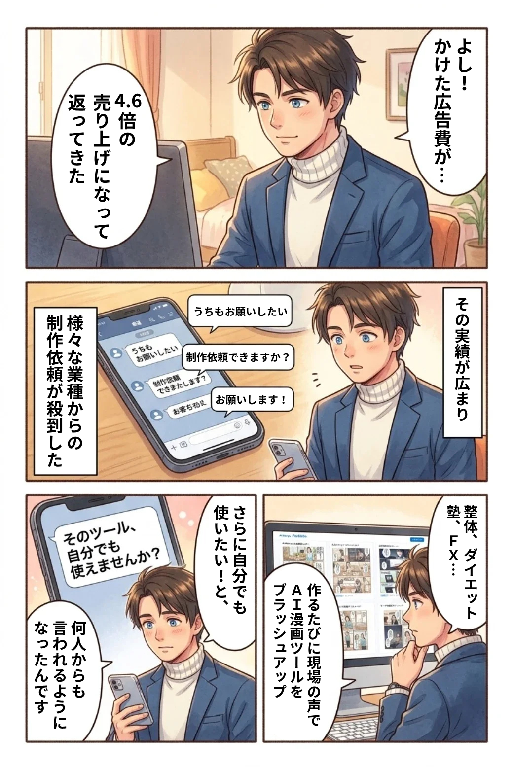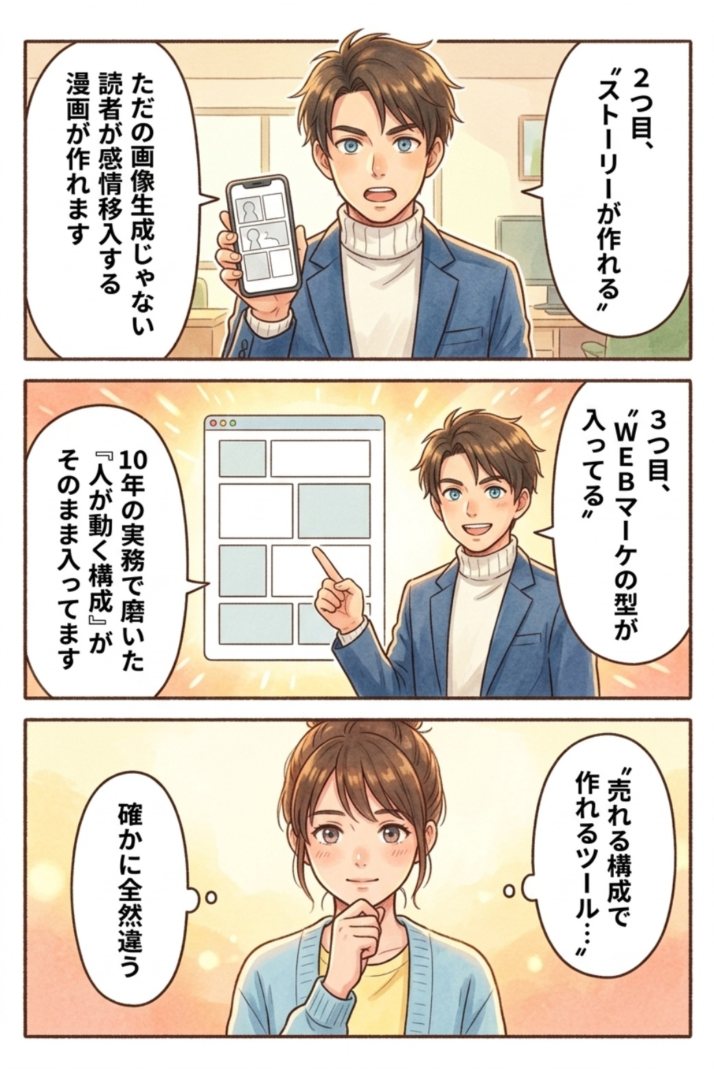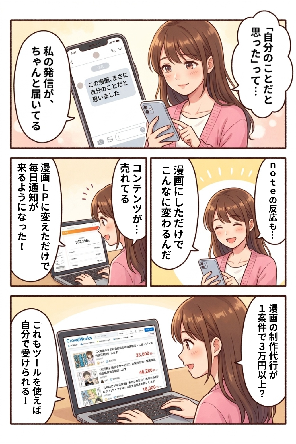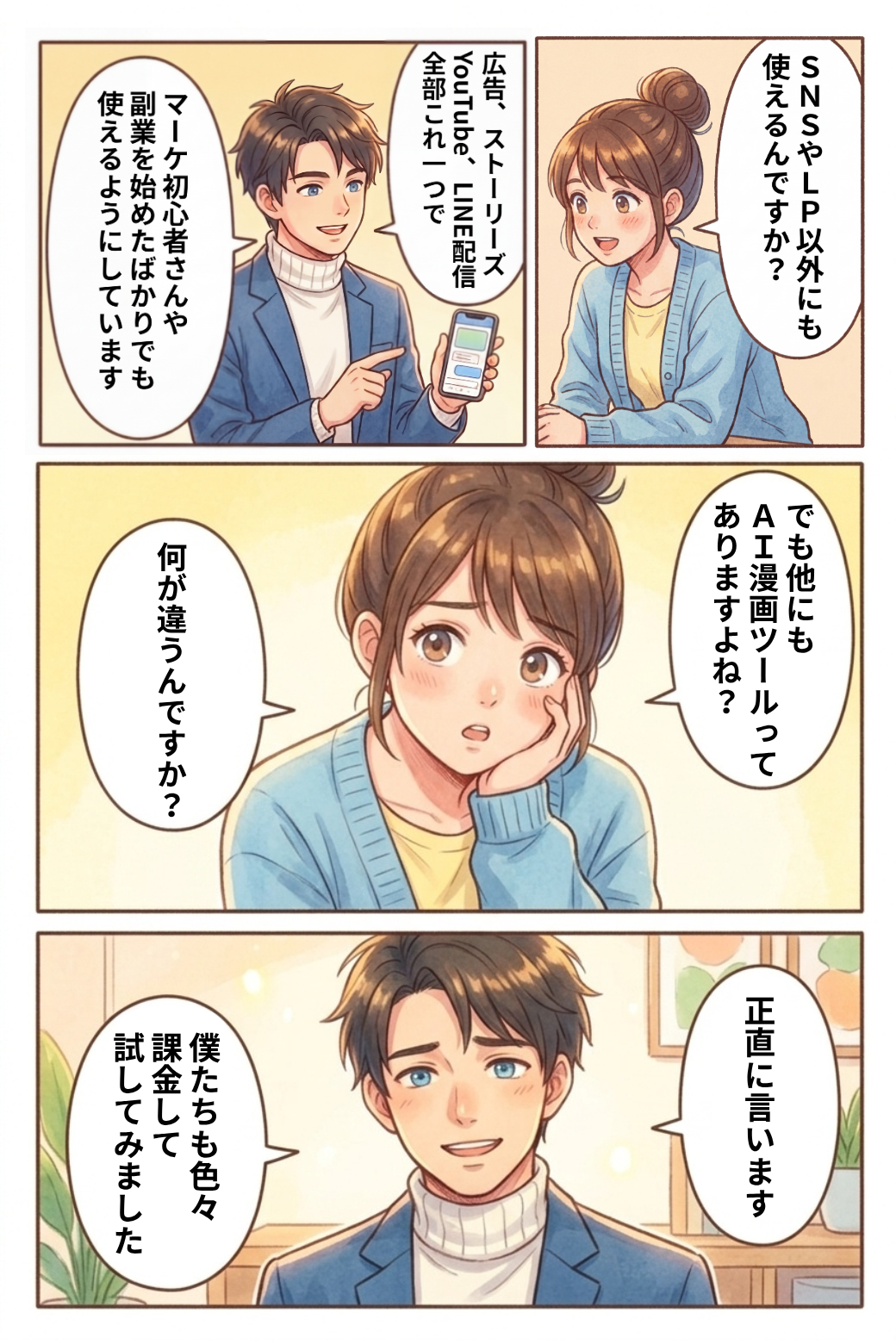 AI時代だからこそ、一目で伝わる漫画が最強です。教材の説明、アフィリエイト投稿、LINE配信——どこに差し込んでも引き込まれる。文章だと"うんちくっぽく"なるこだわりも、漫画なら一瞬でエンタメに変わります。「漫画が購入につながる」という意識を、全マーケターが持つべきです。