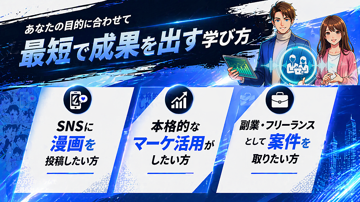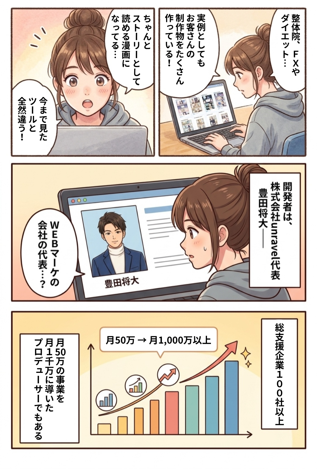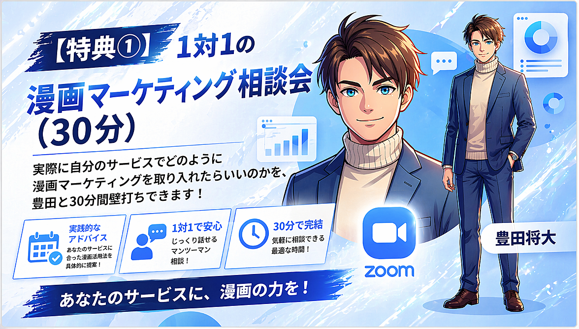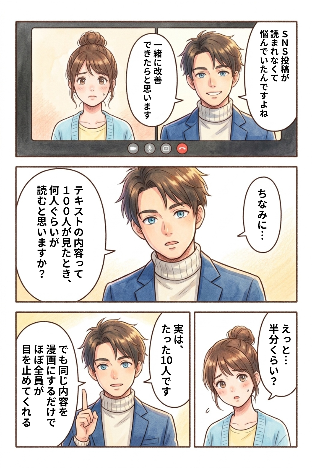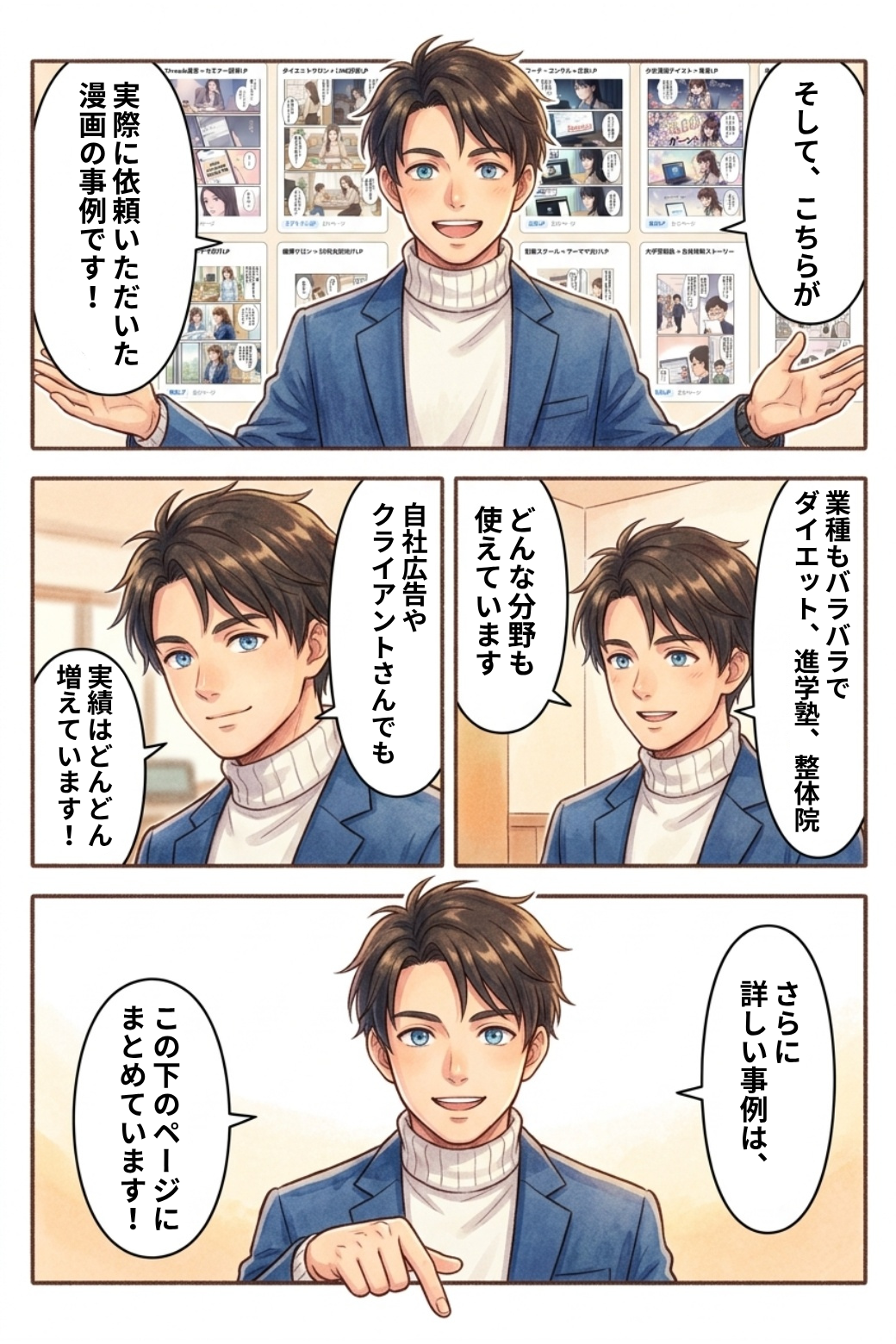 AI時代だからこそ、一目で伝わる漫画が最強です。教材の説明、アフィリエイト投稿、LINE配信——どこに差し込んでも引き込まれる。文章だと"うんちくっぽく"なるこだわりも、漫画なら一瞬でエンタメに変わります。「漫画が購入につながる」という意識を、全マーケターが持つべきです。