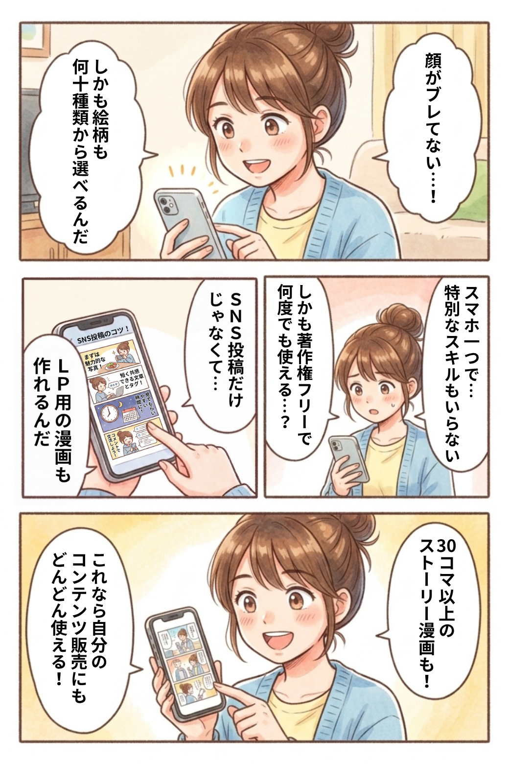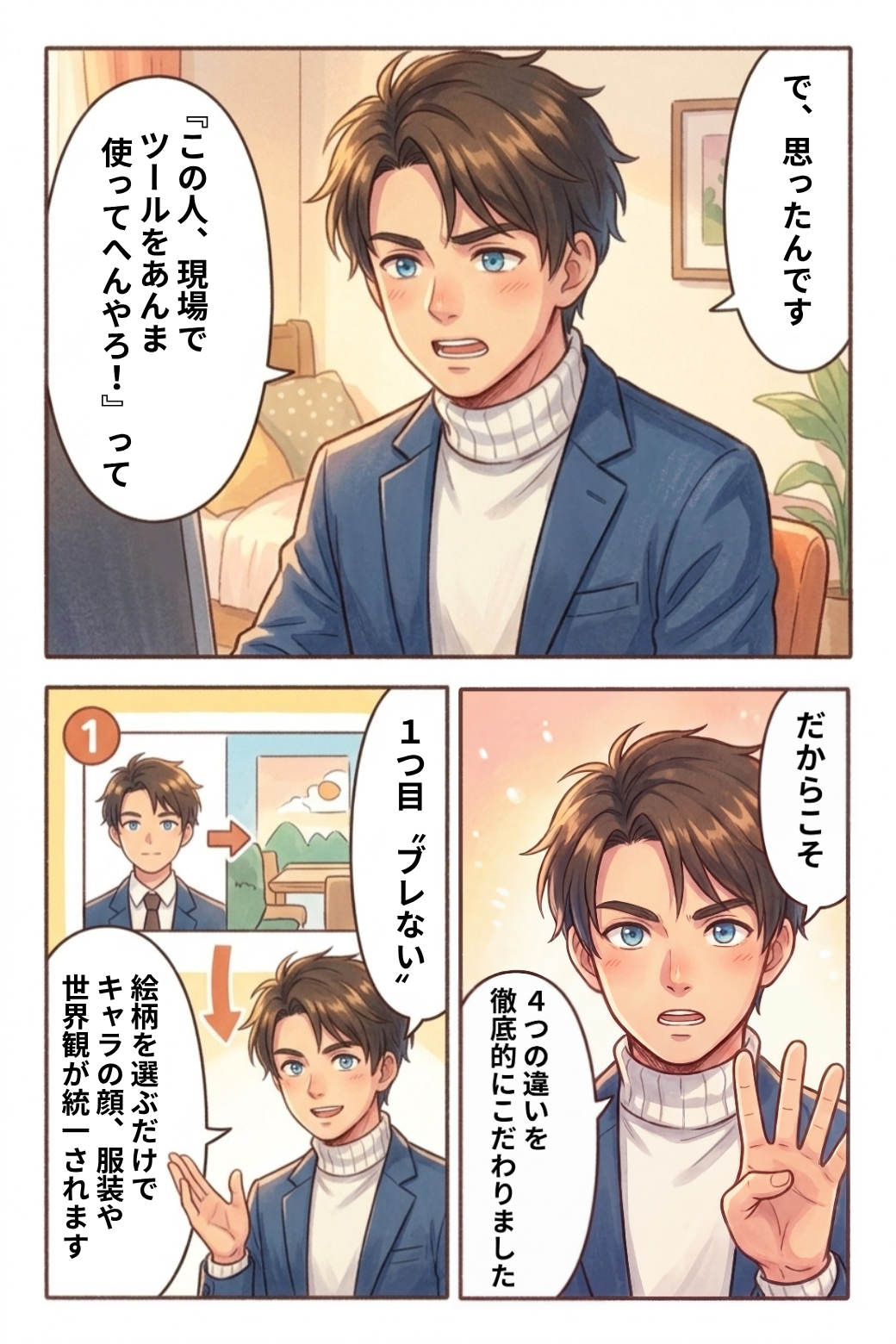 AI時代だからこそ、オリジナルキャラを使ったマーケティングが最強の武器になります。2次利用・3次利用の追加料金に悩むことなく、自社IPとして漫画・アニメ・広告に展開できる。"作りたい"という欲求がある人ほど、このツールは手放せなくなるはずです。僕自身、生成フローは分かっていても"これは自分でやりたくない"と思うくらい、チューニングの手間が省かれていますね