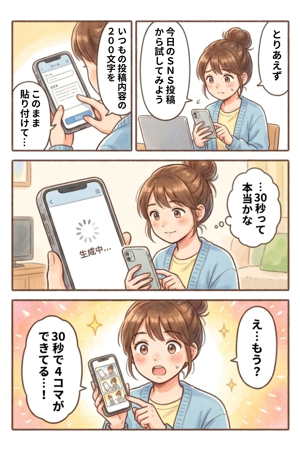 僕はブログのリード文に4コマ漫画を差し込んでたんですが、外注すると1本5,000円。それがこのツールで一瞬で作れます。Xの記事に漫画を10個繋げて"漫画記事"にするのも、今やってる人ほぼいないので差別化になります。文章が読まれない時代、読ませる武器になりますよ。