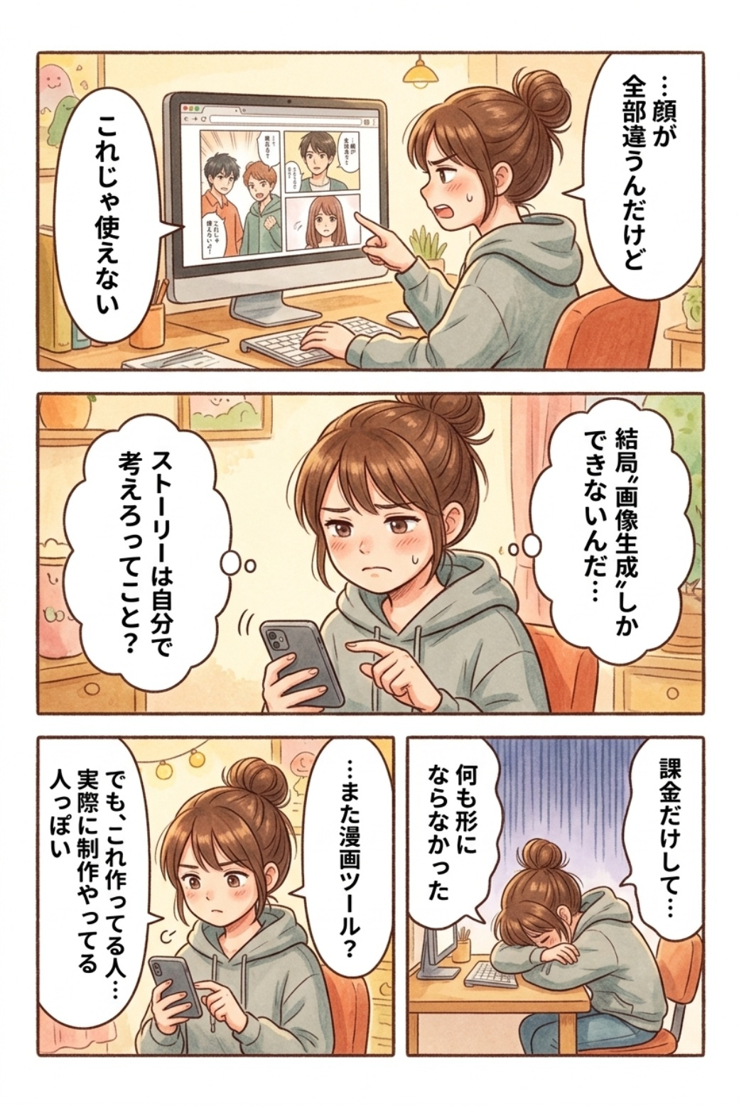 60ページ・152コマの漫画ロードマップを、育児のすき間時間だけで2〜3日で仕上げられました。忙しい子持ちでもポチポチするだけで、自分が思っている以上の仕上がりに120%昇華してくれる。Kindleの上位ランキングは読了率で決まるので、漫画本は間違いなく穴場です。このツールが広まる前に参入するのが勝ち筋ですね。