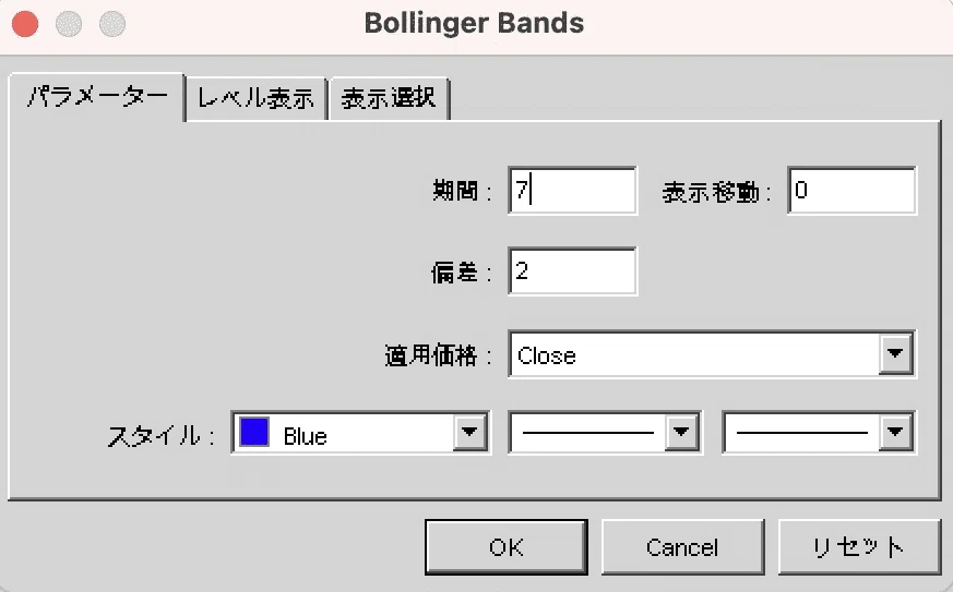 次にボリンジャーバンドを期間「7」、偏差「2」と設定します。