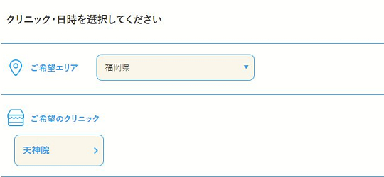 天神院でのカウンセリングを希望する場合は、希望エリアでは『福岡県』、希望のクリニックでは『天神院』を選択します。