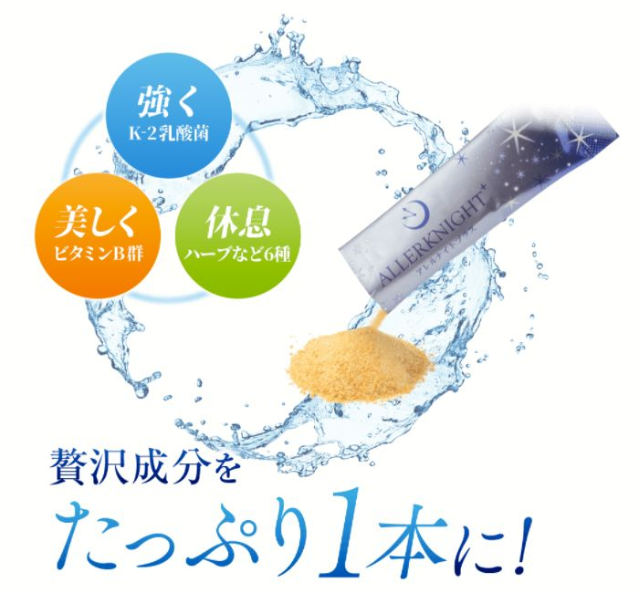 アレルナイトプラスは体にやさしいK-2乳酸菌が主成分になっている『かゆみ×睡眠に特化』したサプリメントです。