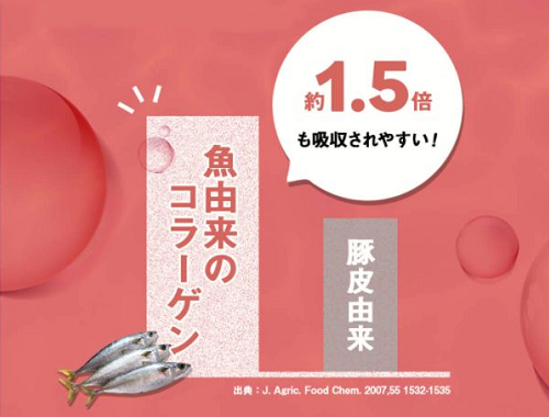 従来の豚皮由来のコラーゲンと比べて約1.5倍も吸収されやすいことが分かっています。