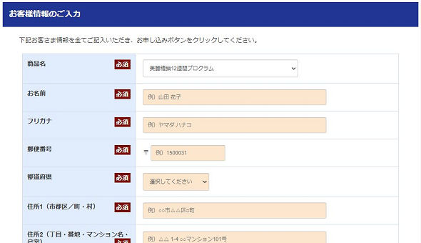 商品名の選択(12週間プログラムと1袋トライアル)や、あなたの氏名、住所、電話番号、メールアドレス、パスワードなどを入力していきます。