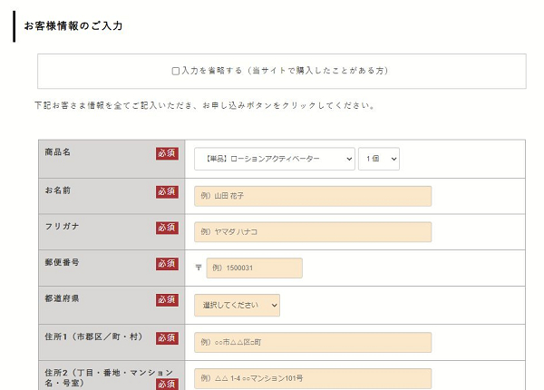 購入する商品名(単品、定期コース)や氏名、住所、電話番号、メールアドレス、パスワードなどを入力します。