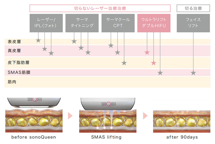 クリニックフォアでは『SONOQUEEN(ソノクイーン)』という医療ハイフ機器を導入しています。