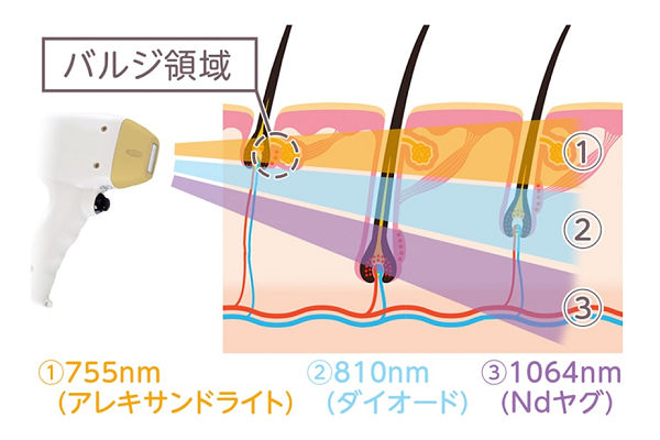 その中間の810nm(ダイオード)と合わせた3波長を組み合わせることで、蓄熱の温度上昇効率が上がり、濃い毛からうぶ毛までより効果的な脱毛が可能です。