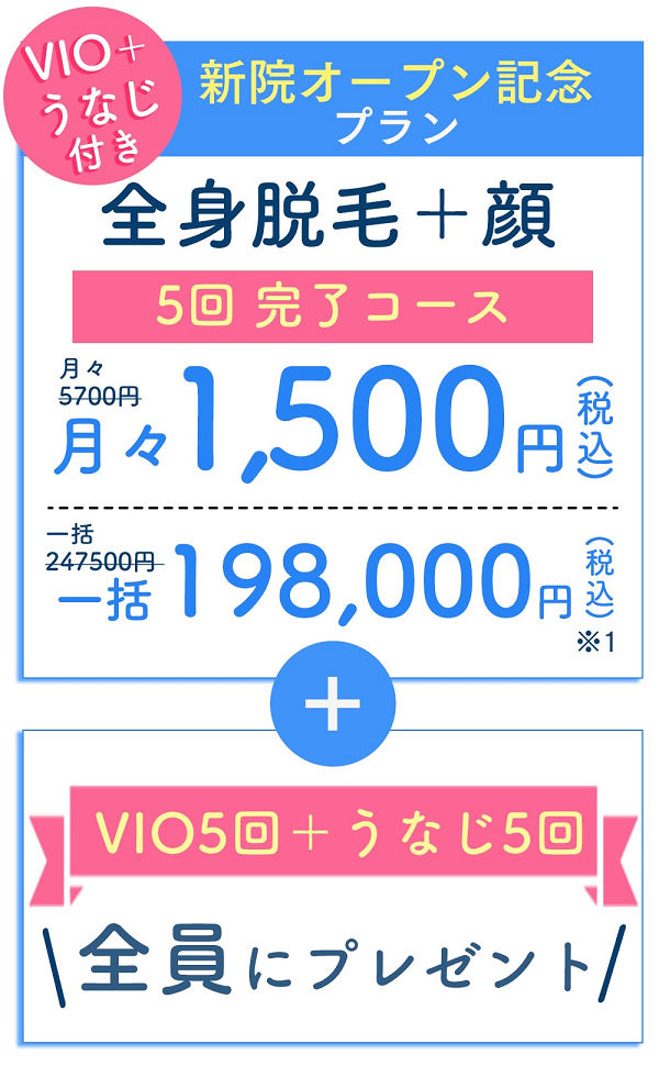 全身脱毛+顔5回が月々1,500円~