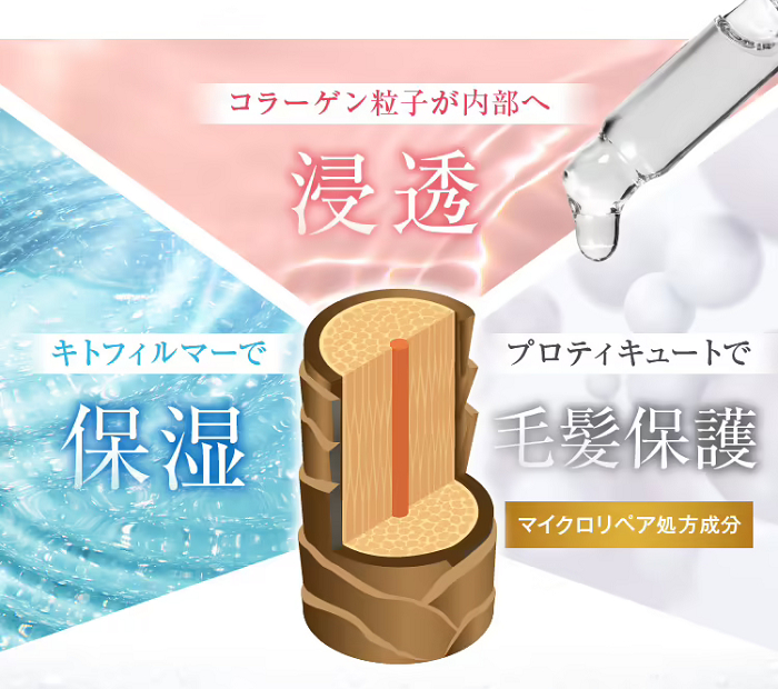 コラーゲン粒子は内側に浸透していき、キトフィルマーには保湿、プロティキュートには毛髪保護の働きがあります。