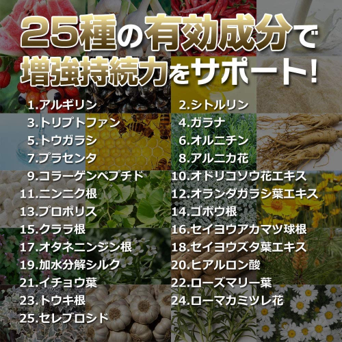 これら2種類の成分以外にも男性に嬉しい成分(ガラナやトリプトファン、トウガラシ、オルニチンなど)が詰め込まれています。