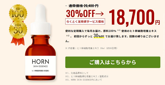 HORNスキンエッセンスでは、ヒト幹細胞培養エキスを100%原料、含有量30%を実現している美容液です。
