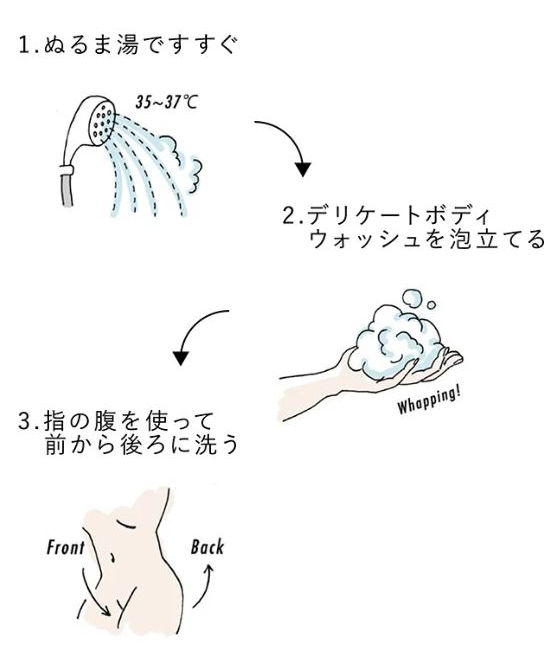 そして指の腹部分を使って、デリケートゾーンの前から後ろに向かって優しく洗えばオッケーです。
