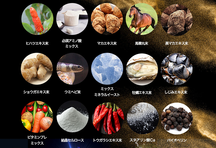 その他にも、ヒハツエキス末やマカエキス末、馬睾丸末、ショウガエキス末、バイオペリン、海へブ末などの男性にとって嬉しい成分もバランス良く配合されています。