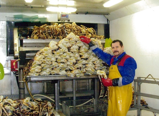 深海から引き揚げられたカニは、すぐに船内の加工機械に運ばれて、『洗浄→加工→ボイル→急速冷凍』作業が行われます。