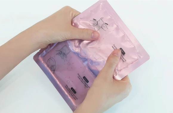 まずは開封前に両側のタブに指を入れて強く引っ張り、美容液をマスクに染みこませます。