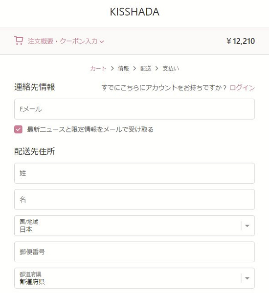 連絡先情報(メールアドレス)と配送先住所(氏名や住所、電話番号など)、支払方法を入力して下さい。