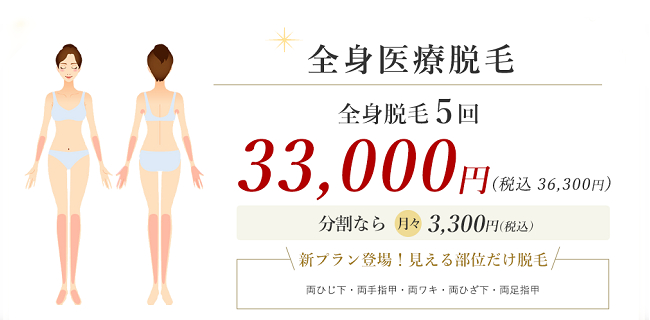 一番手頃な全身脱毛プランで、総額33,000円(税込36,300円)で申し込めます。