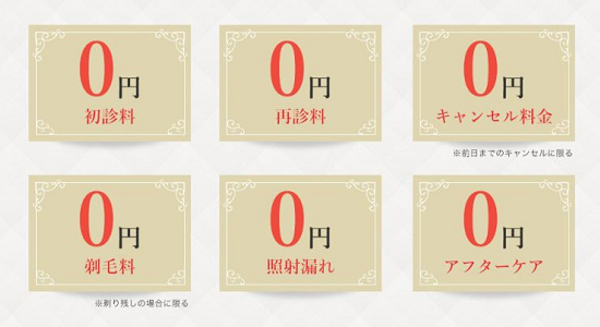 初診料や再診料、キャンセル料(前日までのキャンセル)、剃毛料(剃り残しのみ)、照射漏れ、アフターケア料金は0円で対応してくれます。