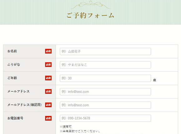 氏名や年齢、メールアドレス、電話番号、利用コース、希望日などを入力・選択します。