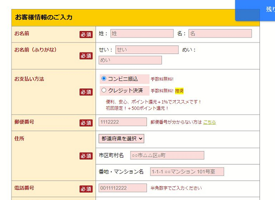 あなたの氏名や支払方法、住所、電話番号、メールアドレスなどを入力していきます。