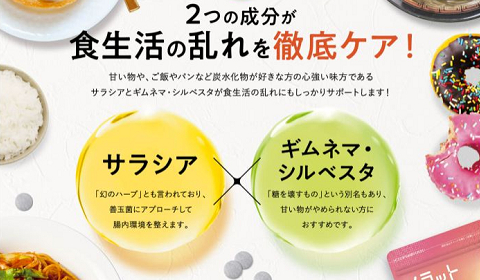 メラット(Meratto)サプリでは、食生活の乱れをケアするためにサラシアとギムネマ・シルベスタも配合しています。