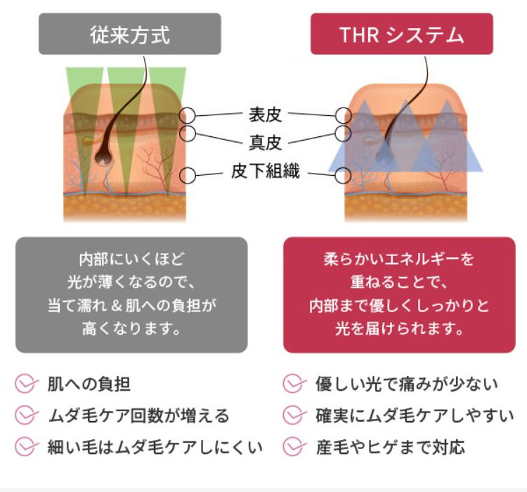上述しているように、THR方式を導入していて肌の内部に熱が広がる仕組みになっているので、従来の家庭用脱毛器と比べても低刺激です。