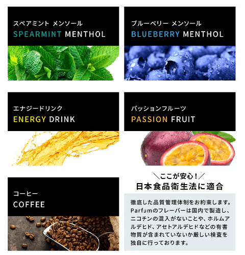 スペアミントメンソール、ブルーベリーメンソール、エナジードリンク、パッションフルーツ、コーヒーの5種類の厳選フレーバーが用意されています。