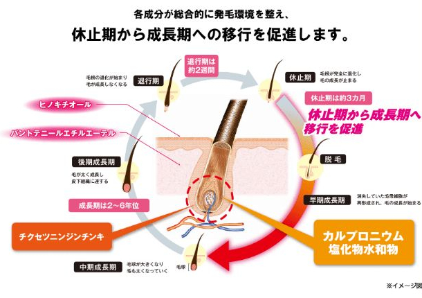 カルプロニウム塩化物水和物には、毛根の血行を促進する働きが確認されています。