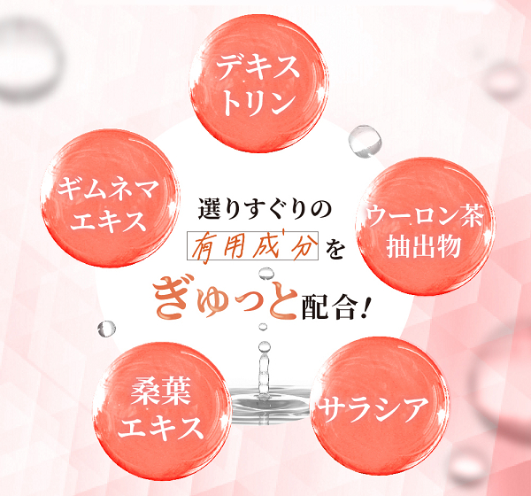 具体的にはデキストリンとギムネマエキス、ウーロン茶抽出物、桑葉エキス、サラシアです。
