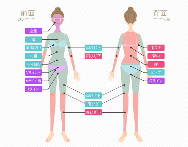 目に見える部位が施術対象(ピンク部分)になっていて、手軽に全身脱毛をしたい方におすすめです。