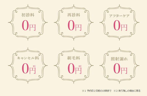 初診料や再診料、アフターケア、キャンセル料(予約日2日前の15時まで)、剃毛料(剃り残しの場合)、照射漏れなどの費用は一切請求されません。