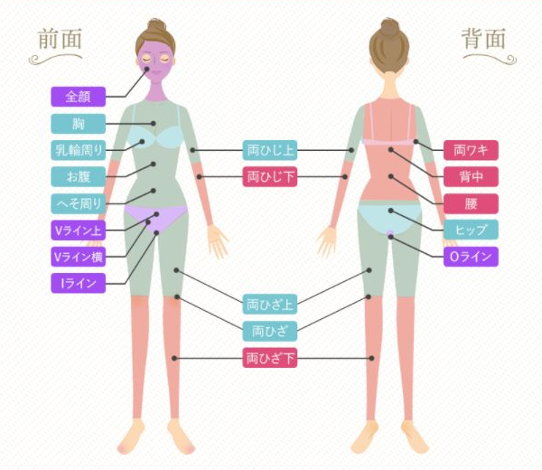 顔とVIO以外(胸 ・乳輪周り・お腹・へそ周り・両ひじ上・両ひじ下・両ひざ上・両ひざ下・両ワキ・背中・腰・ヒップ)が施術対象となっています。
