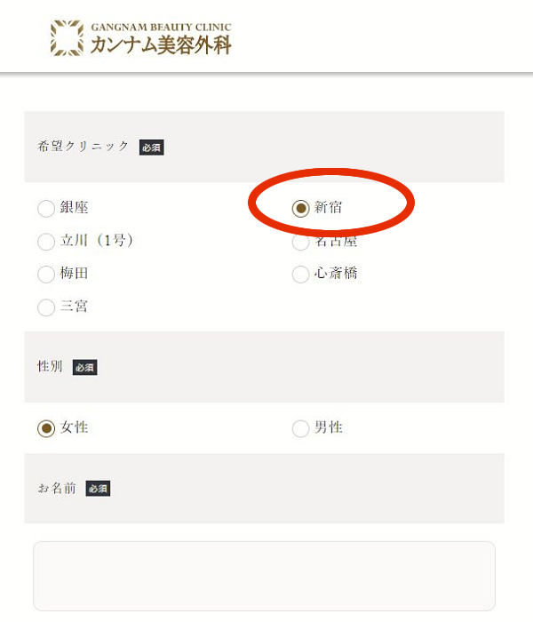 まず最初に、受診を希望するクリニック(新宿院)を選択して下さい。