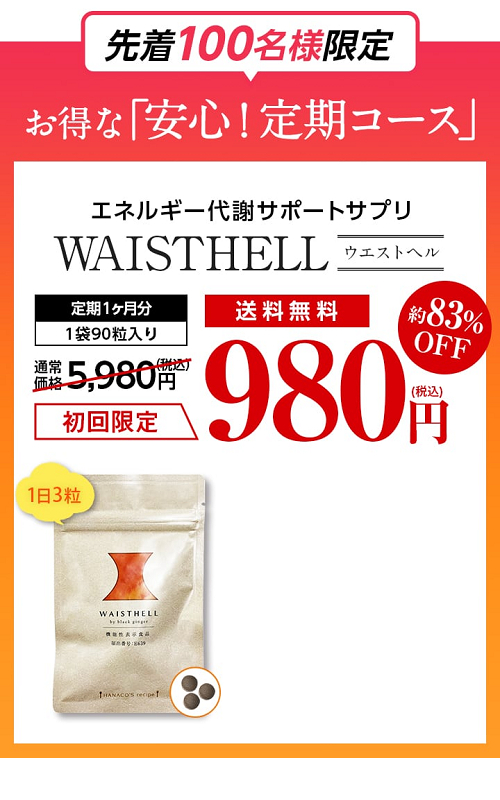 ウエストヘル(WAISTHELL by black ginger)は、SNSを中心に話題になっているエネルギー代謝サポートサプリです。